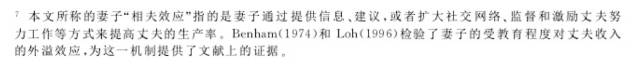本文利用1989—2009年中国健康与营养调查数据(CHNS)研究我国男性工资婚姻溢价及其产生的原因。本文发现在控制相关特征变量之后,在婚男性工资比非在婚男性工资显著高出6.8%。究其原因,本文发现我国的男性婚姻溢价无法使用婚后家庭内部专业化分工、男性婚后责任感增强以及女性选择优秀的男性作为配偶来解释,但是可以由妻子的"相夫"特征所解释。